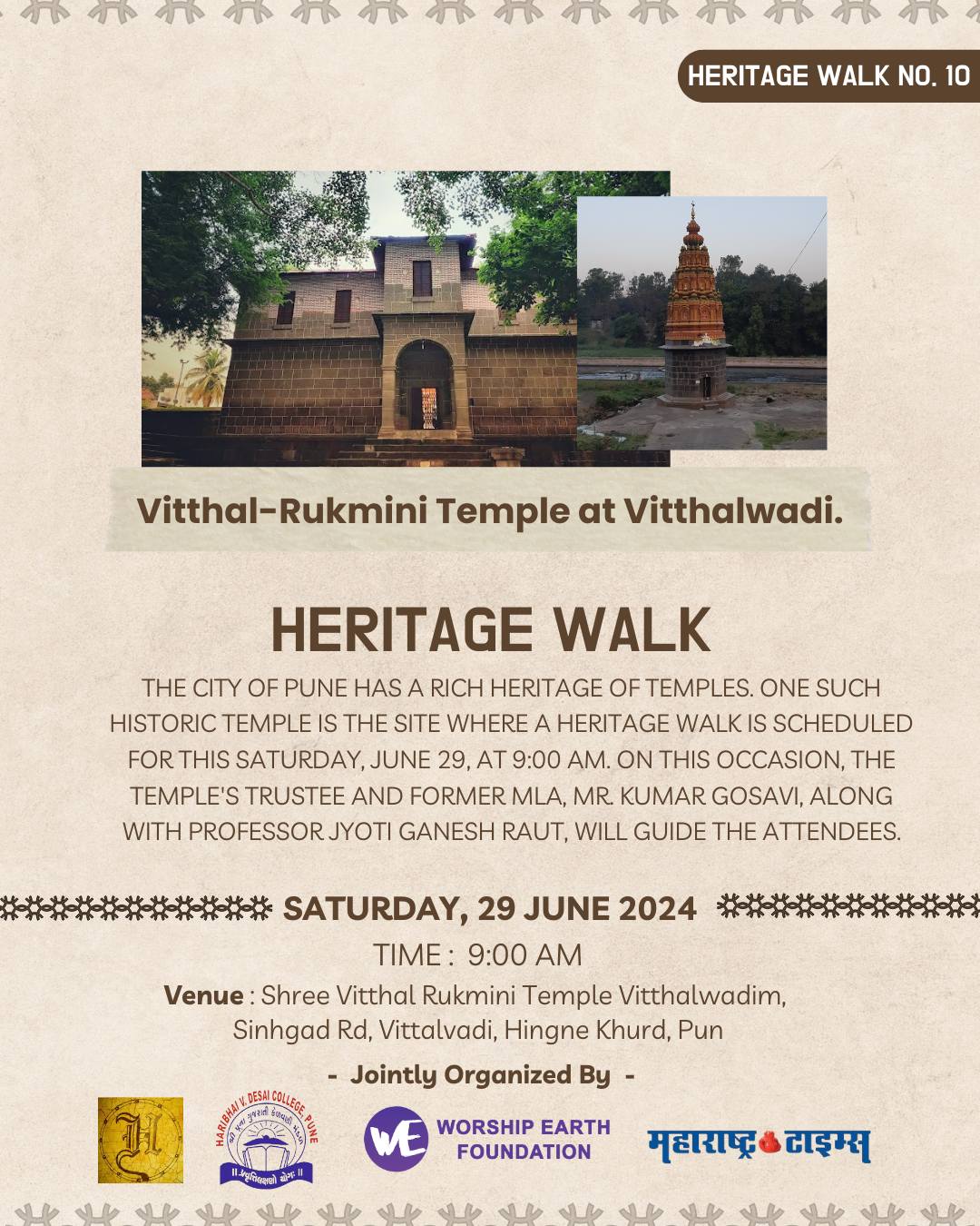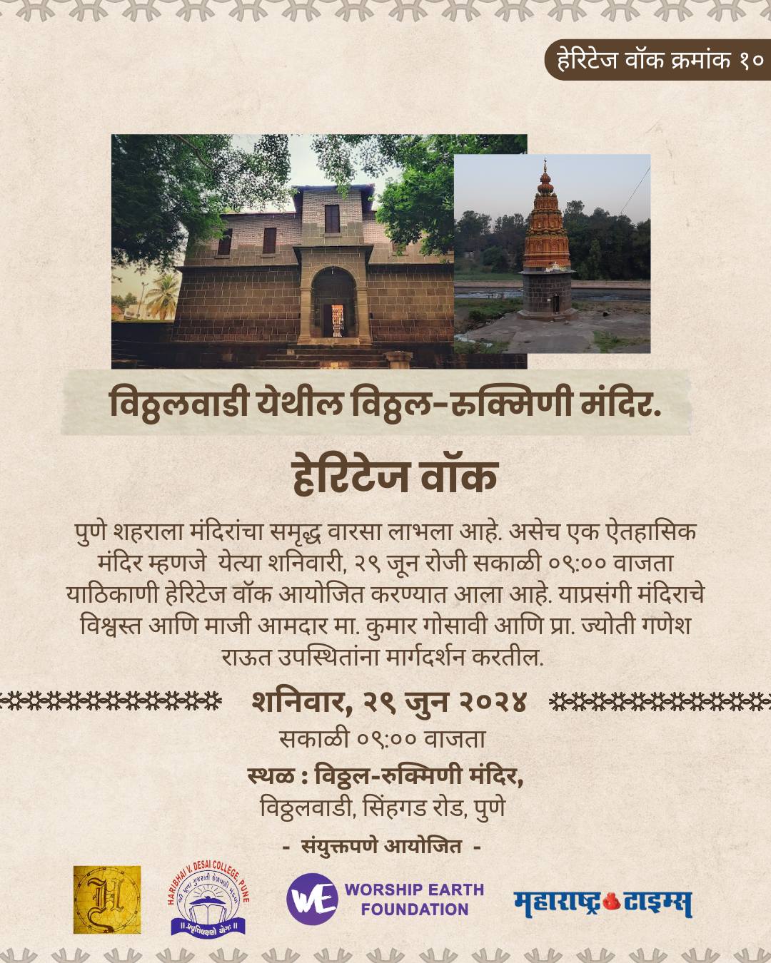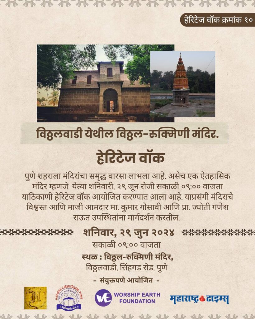 A Heritage Walk took place at the historical Vitthal-Rukmini Temple in Vitthalwadi on Saturday, June 29, 2024, at 9 AM. This event highlighted Pune’s rich heritage of temples, focusing on the significant historical and cultural value of the Vitthal-Rukmini Temple. The walk was guided by Hon. Kumar Gosavi, the trustee of the temple and former MLA, along with Professor Jyoti Ganesh Raut, who provided insightful commentary on the temple’s history and significance.