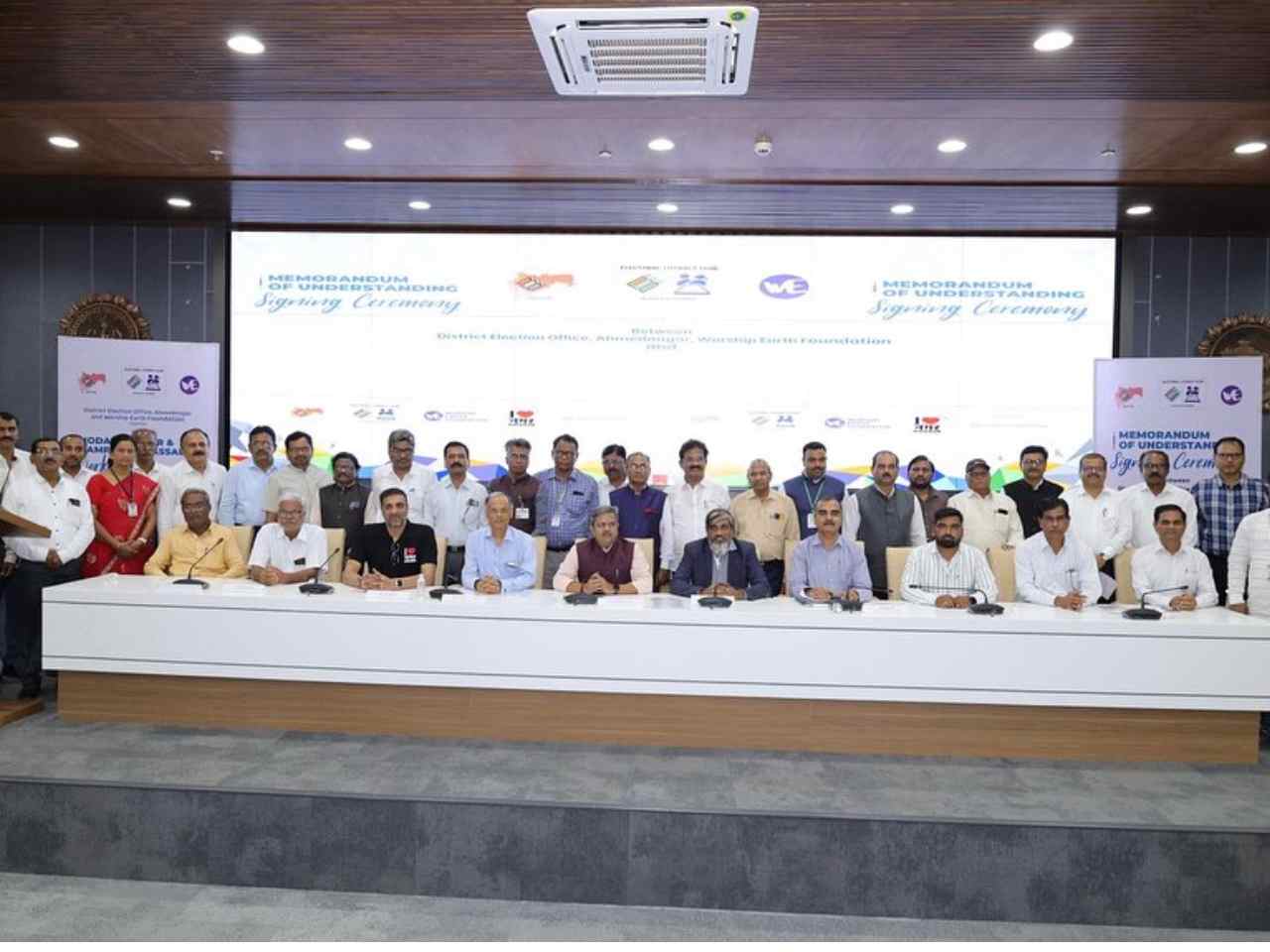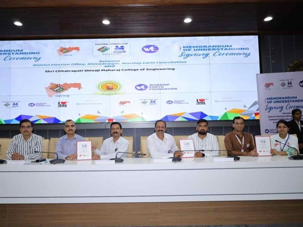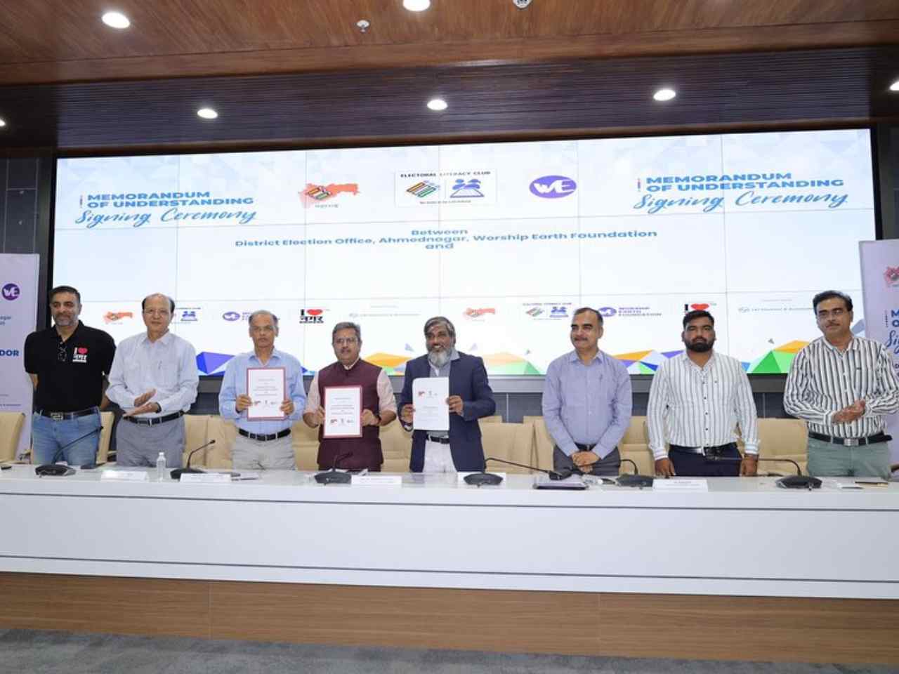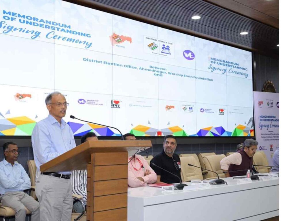 On September 15, 2023, a significant milestone was achieved with the MoU Signing Ceremony and Workshop Session in Ahmednagar, marking a pivotal moment in our efforts to promote electoral literacy. This event was graced by notable dignitaries, including Mr. Shrikant Deshpande, Additional Chief Secretary & Chief Electoral Officer of Maharashtra; Mr. Siddharam Salimath, District Collector and District Election Officer of Ahmednagar; Mr. Rahul Patil, Deputy Collector & Deputy District Election Officer of Ahmednagar; Mr. Arvind Pargaonkar, Director-Manufacturing at L&T Electrical & Automation; Mr. Tejas Gujarathi, MD and CEO of Worship Earth Foundation; and Mr. Narendra Firodia, Founder of ‘I Love Nagar’ and Chairman of Soham Group. Their presence and support underscored the importance of this initiative.