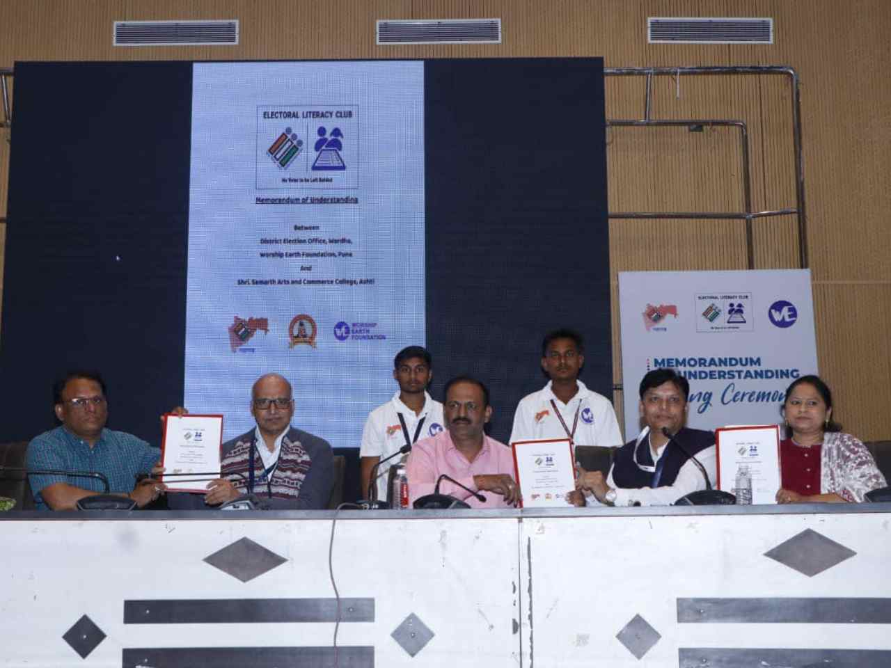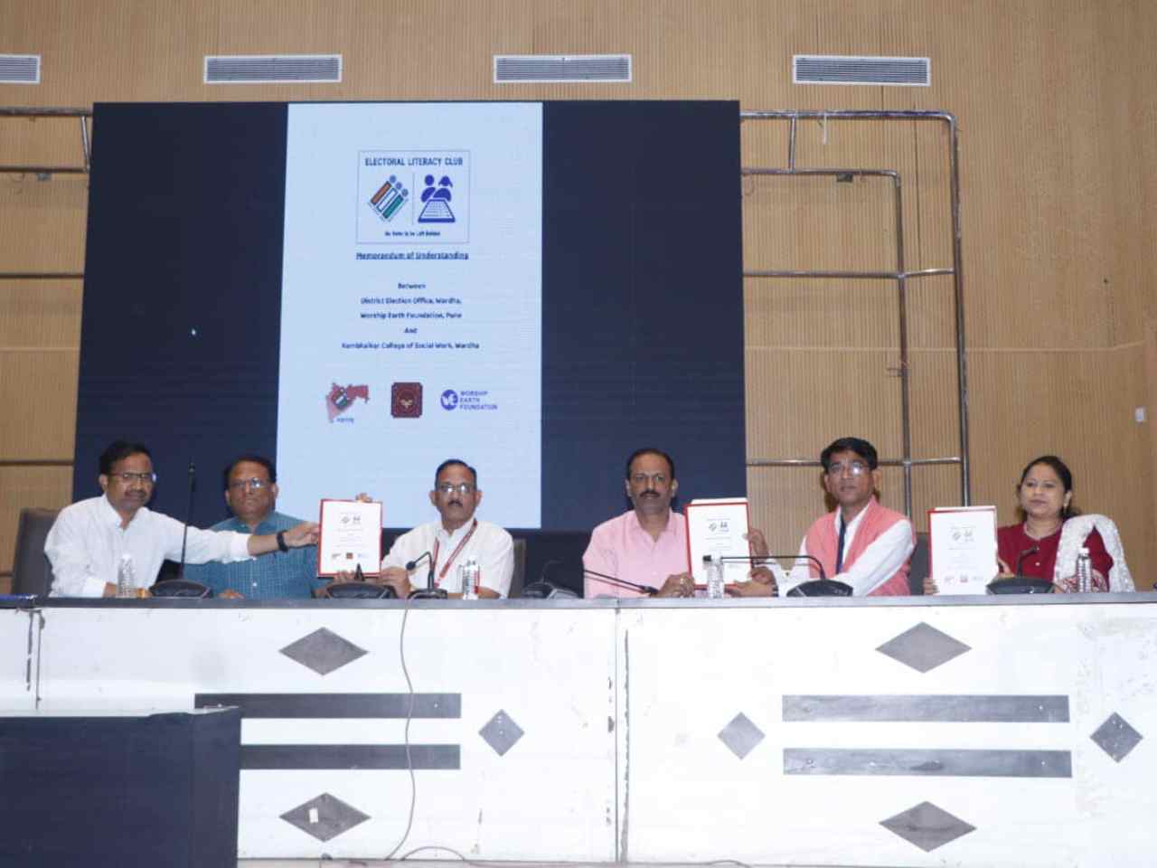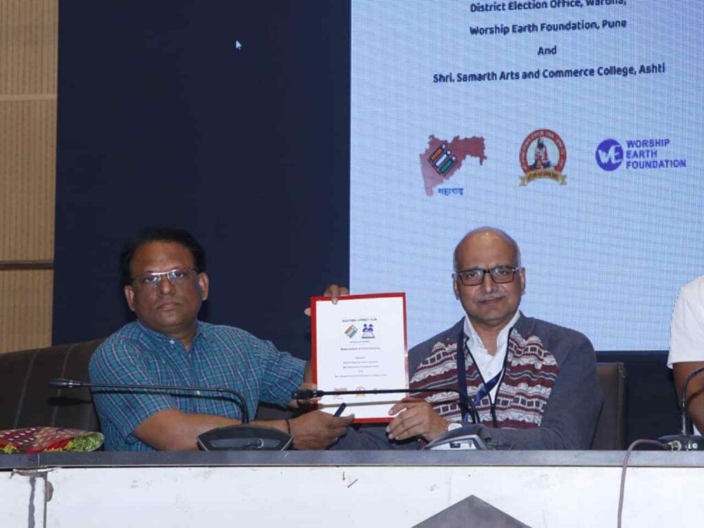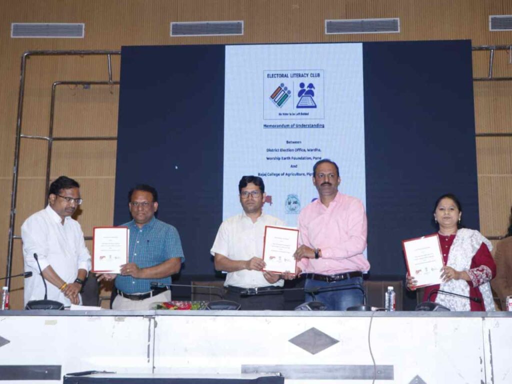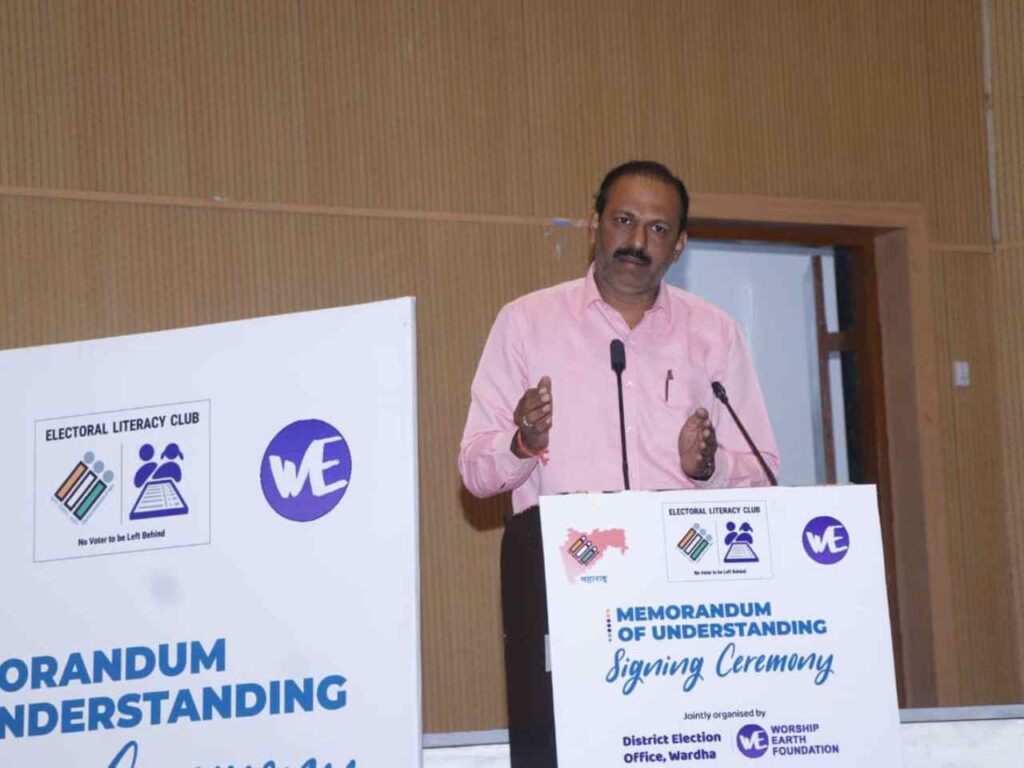 On January 17, 2024, an inspiring MoU signing ceremony took place between the District Election Office, Wardha, and Worship Earth Foundation. This landmark event marked the formation of Electoral Literacy Clubs in 21 schools across the district, aimed at empowering the next generation with essential knowledge about their electoral rights and responsibilities. The ceremony was graced by esteemed guests including Mr. Rahul Kardile, Wardha District Collector; Mr. Sachin Jagtap, Education Officer; Mr. Atul Raspayle, Deputy Tehsildar; Mr. Altaf Pirzade, Chief State Coordinator of Worship Earth Foundation; and Mrs. Meenakshi Ramteke, Wardha District Coordinator of Worship Earth Foundation.